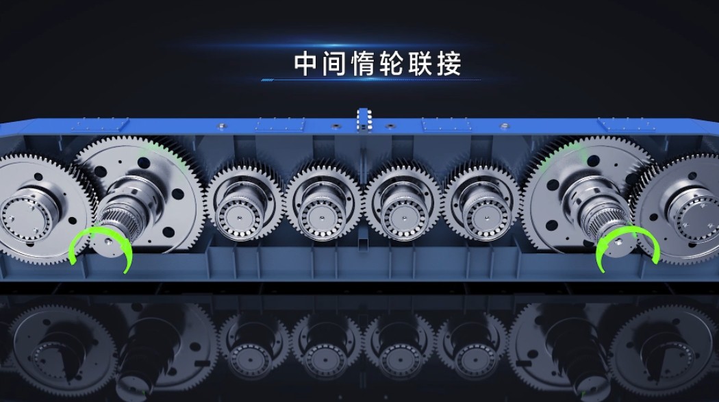 Double-input and output structure with synchronous output, forced lubrication, balanced load, high load capacity, and strong impact resistance.